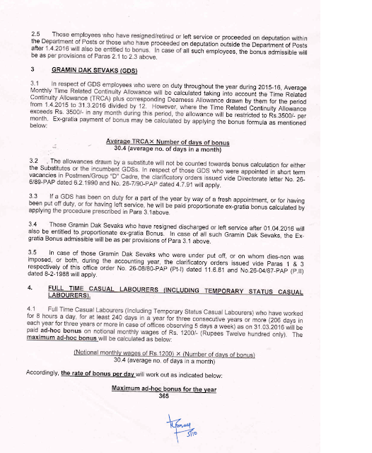 Government has issued order on 05.10.2016 for the payment of Productivity Linked Bonus (PLB) for the accounting year 2015-16 equivalent of emoluments of 60 (sixty) Days to the employees of Department of Posts in Group ‘D’/MTS, Group ‘C’ and non-gazetted Group’B’.