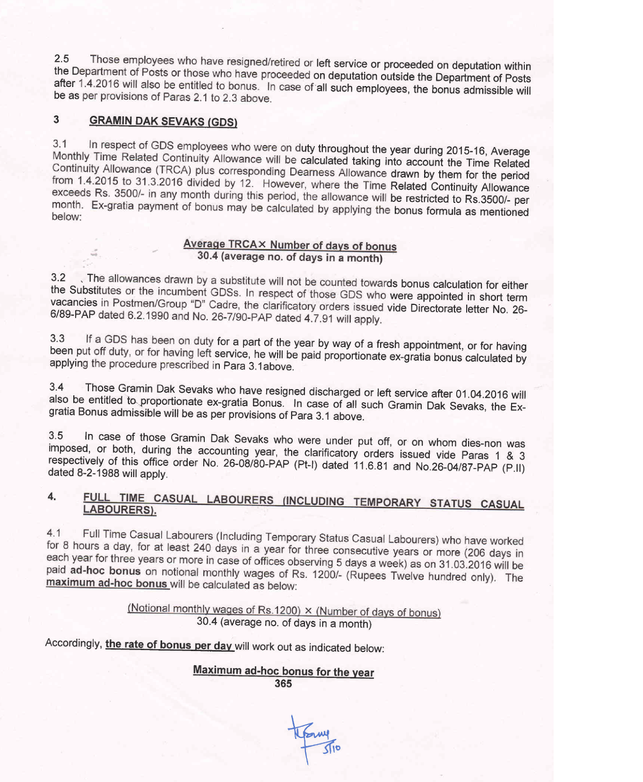Ex-Gratia payment of bonus to Gramin Dak Sevaks who are regularly appointed after observing all appointment formalities, and Ad-hoc payment of bonus to Casual labourers who have been conferred Temporary Status are also to be paid equivalent to allowances I wages respectively for 60 (sixty) Days for the same period.