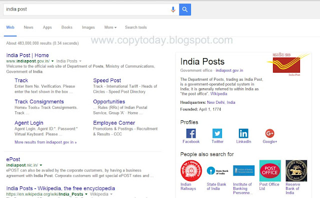 A big mistake from Google has been noticed today in connection with India Post search result. If you search the word “India Post” in Google you will be shocked because instead of India Post logo and the details from Wikipedia site, you will see the details about Thiruvananthapuram University Post Office and its picture.