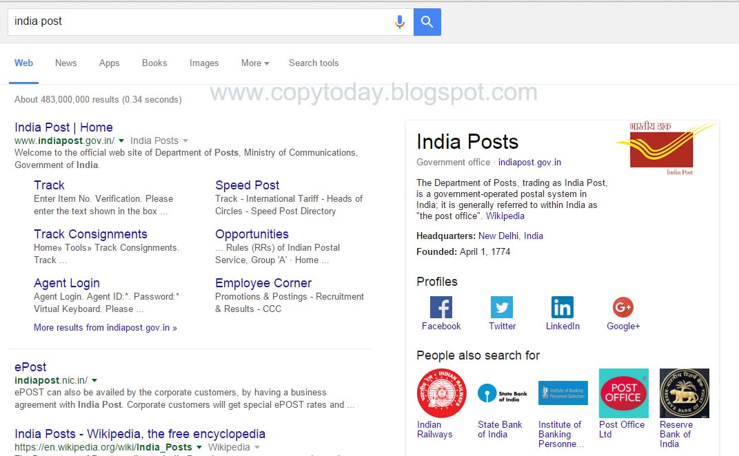 It is very important to regain the actual search result in Google search. So lead a campaign for promoting India Post as a brand in the web world and there by achieve the brand image in Google search result.