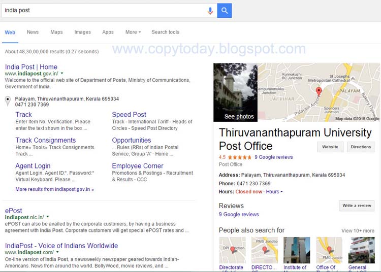 A big mistake from Google has been noticed today in connection with India Post search result. If you search the word “India Post” in Google you will be shocked because instead of India Post logo and the details from Wikipedia site, you will see the details about Thiruvananthapuram University Post Office and its picture.