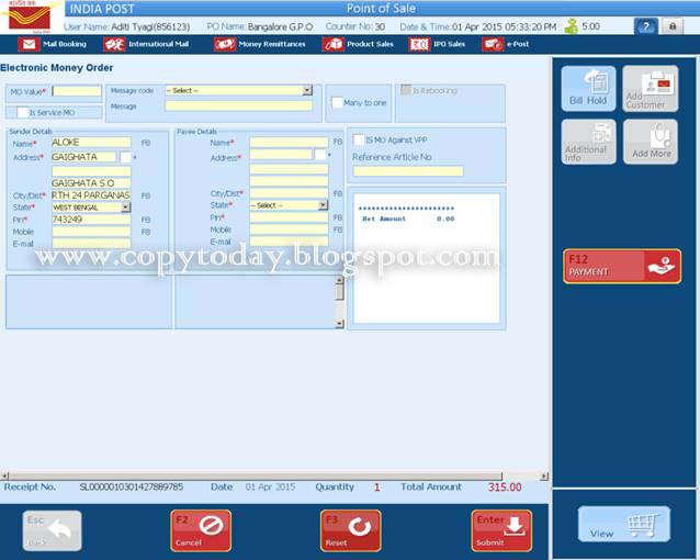 1. Customer can book either eMO (Electronic Money Order), iMO (Instant Money Order) or international MO