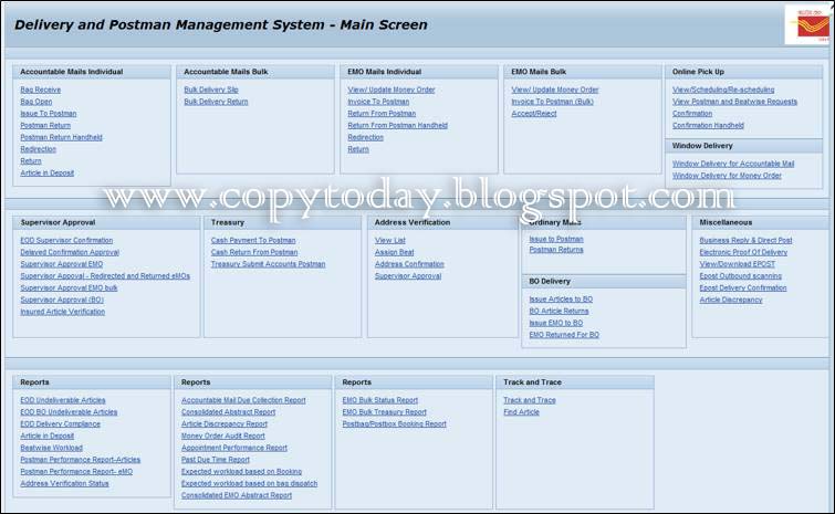 The Delivery and Postman Management System (DPMS) helps Post Office staffs to manage delivery of mails and articles at its post offices. The different types of mail delivery handled under DPMS are: