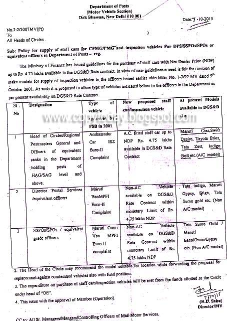 The Ministry of Finance has issued guidelines for the purchase of staff cars with Net Dealer Price (NDP) upto Rs.4.75 lakhs available in the DGS&D Rate contract. In view of new guidelines a need felt for revision of make models for supply of Inspection vehicles to the officers issued earlier vide letter No. 1-7/97-MV dated 9th October 2001. As such it is proposed to allow type of vehicles indicated below to the officers in the Department as per present availability on DGS&D Rate Contract.