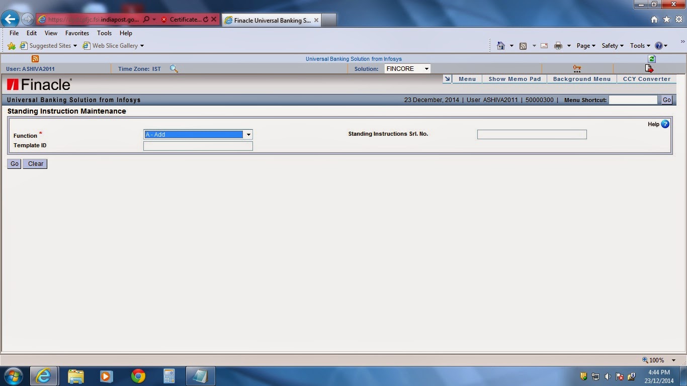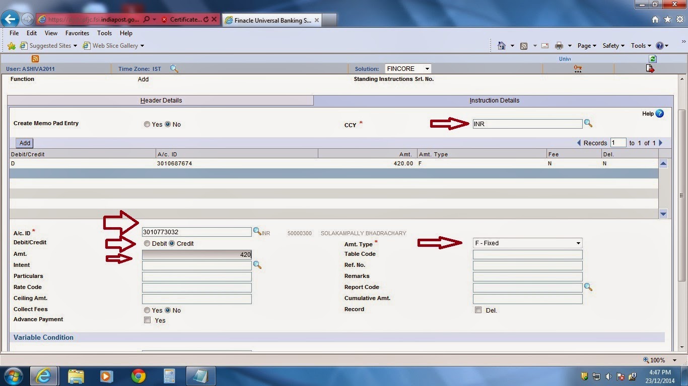 - For giving the standing instructions for TDA accounts(SCSS,MIS and TD) accounts we have to go for account modification menu and enter the interest credit account as SB account number of the customer and submit and verify in the supervisor.
