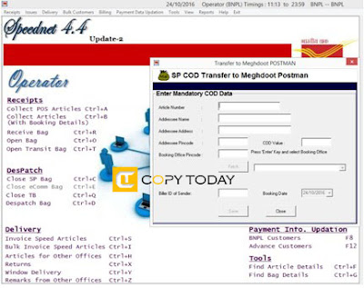 Data Entry option is included in new SpeedNet 4.4.2 and Meghdoot 7.9.6 for handling COD articles of which Booking message has not been received. Following are the new procedure included in the Speednet and Postman module.