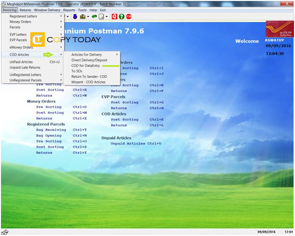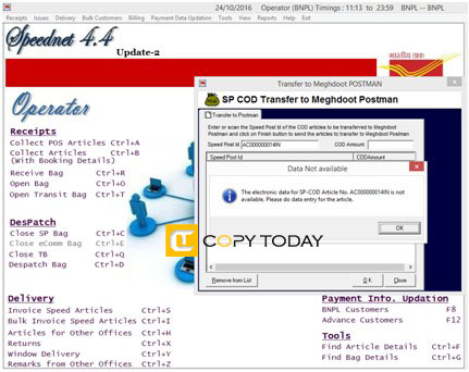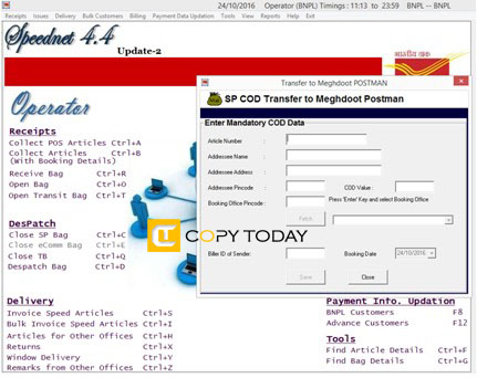 Data Entry option is included in new SpeedNet 4.4.2 and Meghdoot 7.9.6 for handling COD articles of which Booking message has not been received. Following are the new procedure included in the Speednet and Postman module.