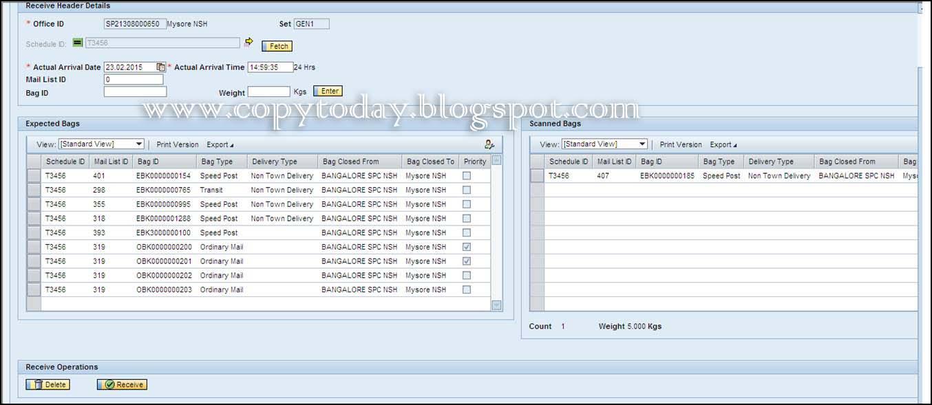 On the Delivery and Postman Management System (DPMS) – Main Screen, click Bag Receive link under “Accountable Mail Individual block”. The Bag Receive screen appears. Before going for this option following points should bear in mind.