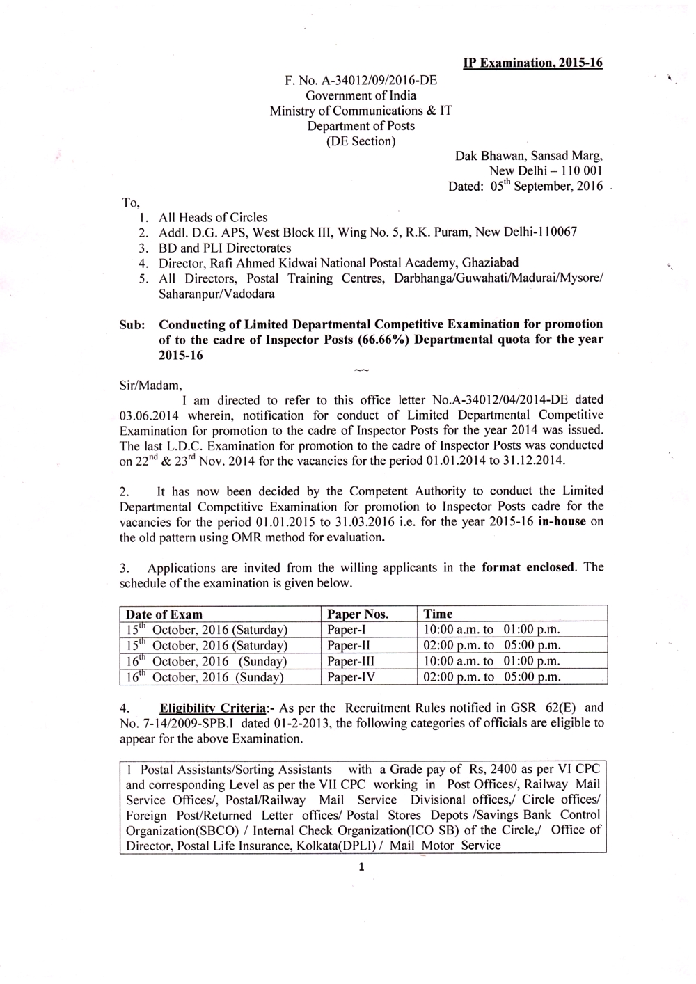 2. It has now been decided by the Competent Authority to conduct the Limited Departmental Competitive Examination for promotion to Inspector Posts cadre for the vacancies for the period 01.01.2015 to 31.03.2016 i.e. for the year 2015-16 in-bouse on the old pattern using OMR method for evaluation.