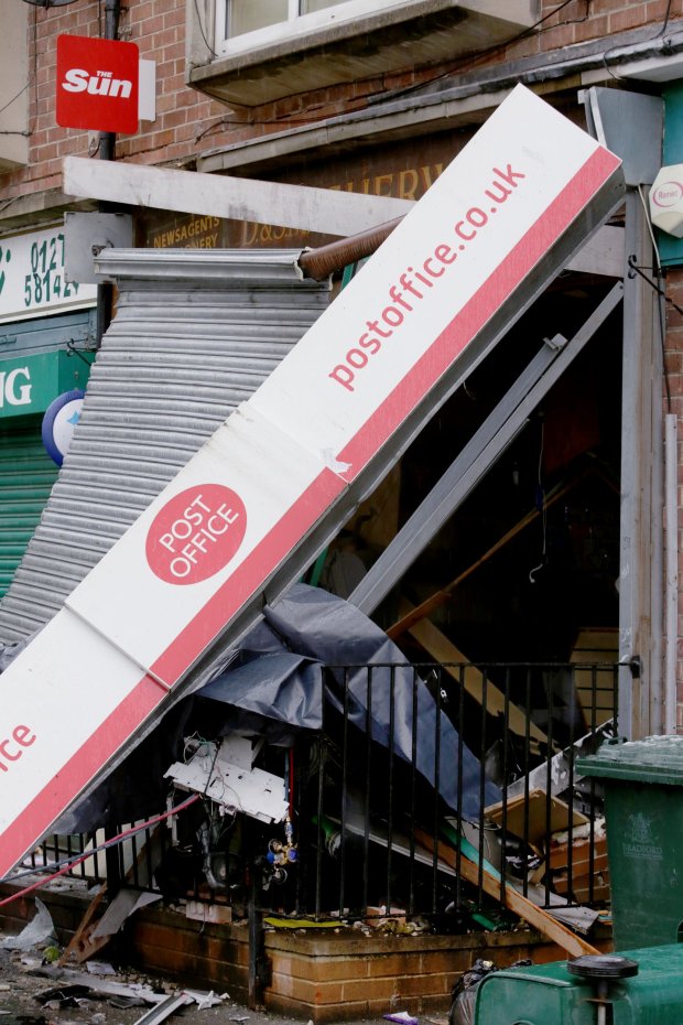 Pictures show the shocking aftermath of a Post Office in Baildon, West Yorkshire, where raiders used explosives to access the ATM money, early this morning.