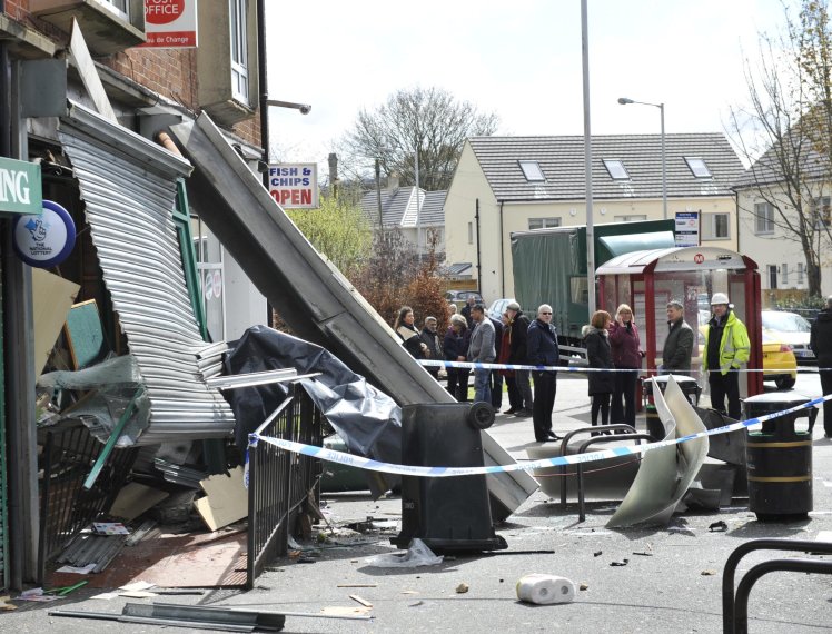 Pictures show the shocking aftermath of a Post Office in Baildon, West Yorkshire, where raiders used explosives to access the ATM money, early this morning.