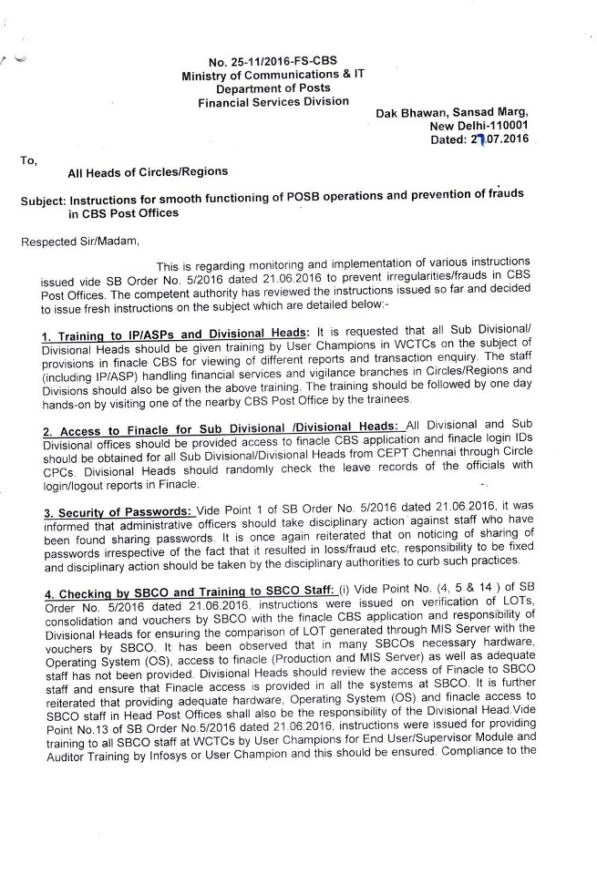 This is regarding monitoring and implementations of various instructions issued vide SB Order No. 5/2016 dated 21.06.2016 to prevent irregularities/frauds in CBS Post Offices. The competent authority has reviewed the instructions issued so far and decided to issue fresh instructions on the subject which are detailed below:-