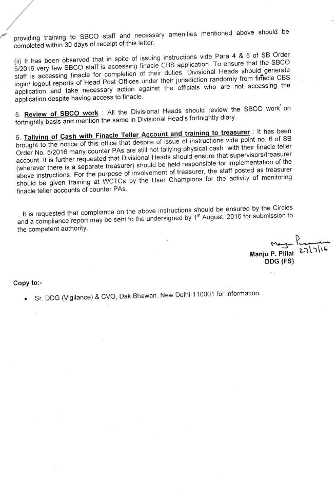 (ii) It has been observed that in spite of issuing instructions vide Para 4 & 5 of SB Order 5/2016 very few SBCO staff is accessing finacle CBS application. To ensure that the SBCO staff is accessing finacle for completion of their duties, Divisional Heads should generate login/ logout reports of Head Post Offices under their jurisdiction randomly from firei cle CBS application and take necessary action against the officials who are not accessing the application despite having access to finacle.
